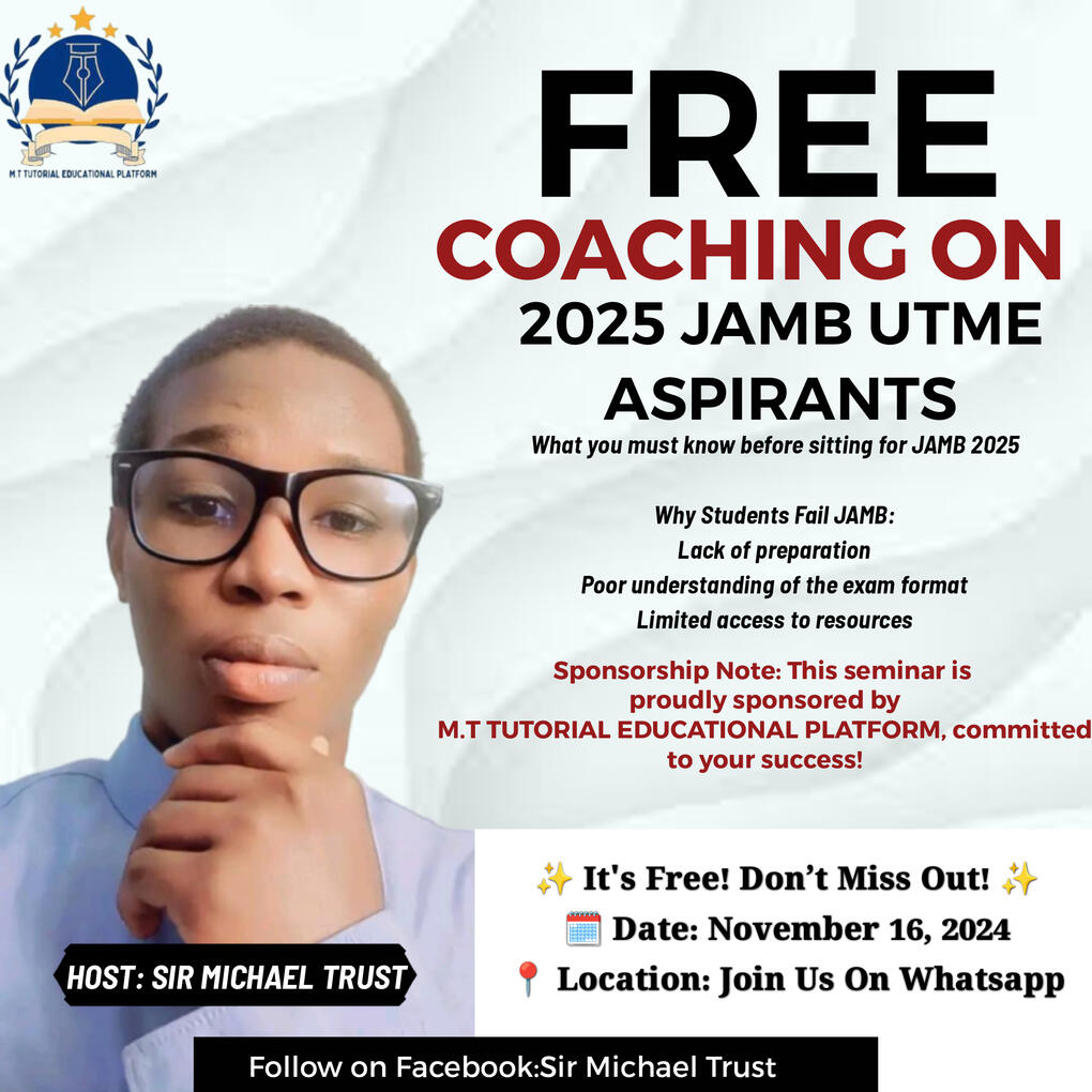 Welcome to M.T Tutorial Platform!At M.T Tutorial, we’re dedicated to helping students achieve academic success through expert guidance and tailored resources. Whether you’re preparing for JAMB, looking to strengthen your understanding in key subjects, or seeking effective study techniques, we’re here to support your learning journey.Explore a wide range of materials, interactive sessions, and comprehensive tutorials designed to empower you to excel in your studies. Join us and take the next step toward your academic goals with confidence and clarity!